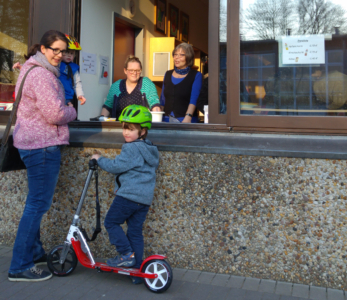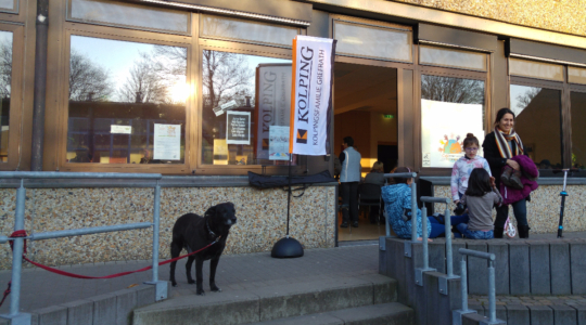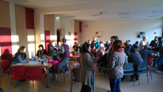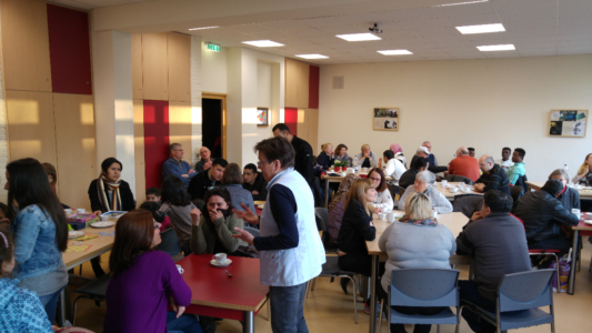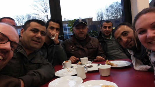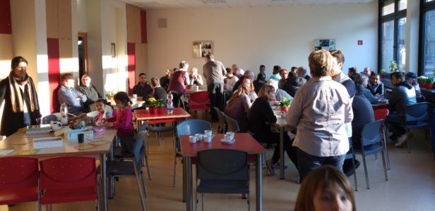 Die Mensa der Sekundarschule war bis auf den letzten Platz belegt, draußen spielten die Kinder in der Frühlingssonne, regelmäßig kamen weitere Grefrather oder Flüchtlinge hinzu, andere verabschiedeten sich, um z.B. zum Fussballtraining zu gehen. Der helle und gemütlich dekorierte Mensa-Raum ist gefüllt von Gesprächen, Waffel- und Kaffeegeruch, lustigen und ernsthaften Kennenlern-Gesprächen, deutschen, englischen, arabischen oder auch türkischen Wortfetzen. Man duzt einander, lernt neue Vornamen kennen, fragt nach Herkunftsländern und -routen, Familienangehörigen, lacht über Handy-Selfies und freut sich gemeinsam über einen entspannten Abend. Schön, dass Ihr alle da wart! Wir freuen uns schon auf nächste Woche.